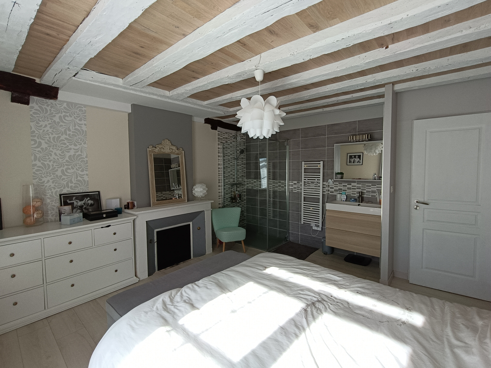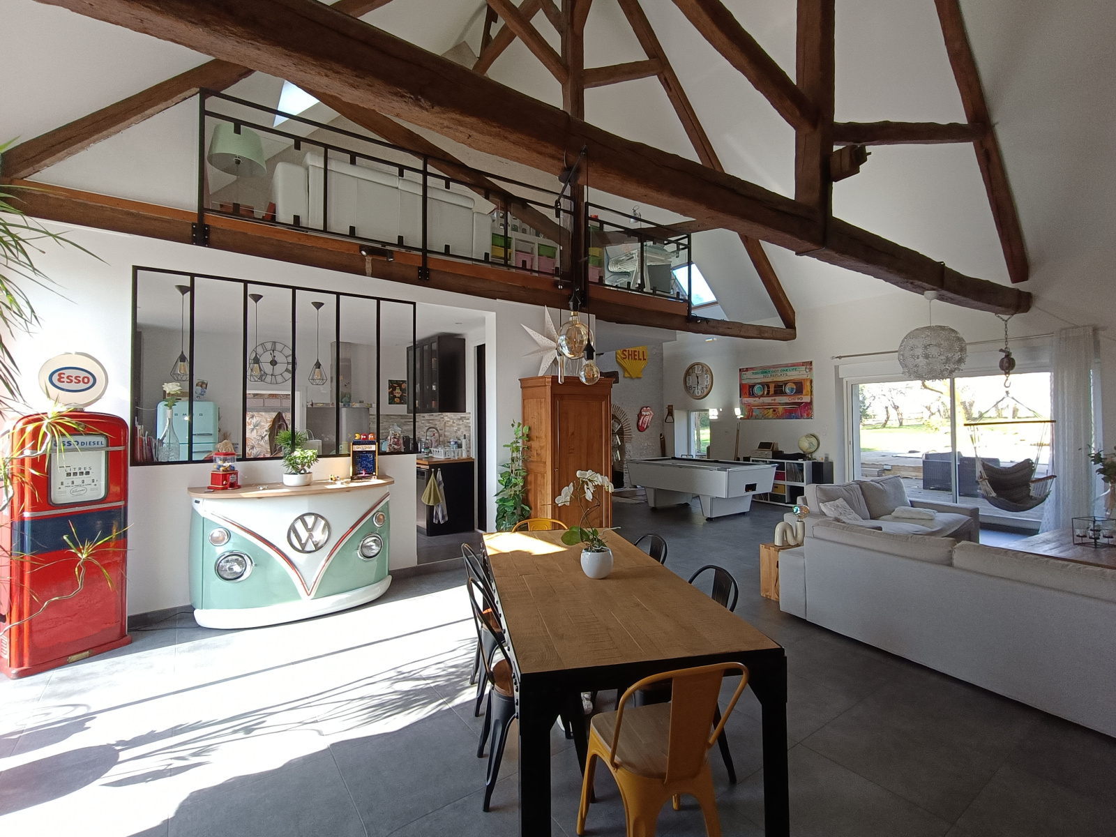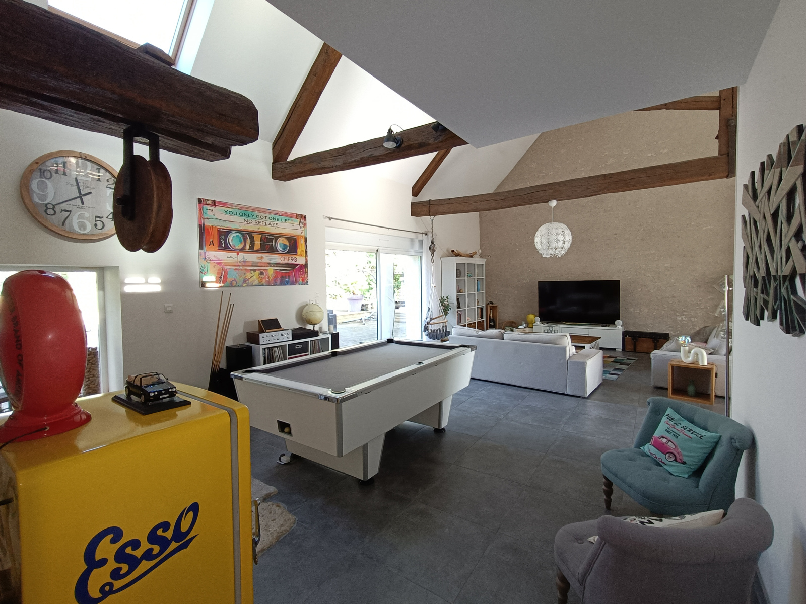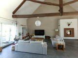 Vous découvrirez un vaste salon/séjour baigné de lumière, sublimé par une cheminée avec insert, idéal pour les moments de convivialité en famille ou entre amis.