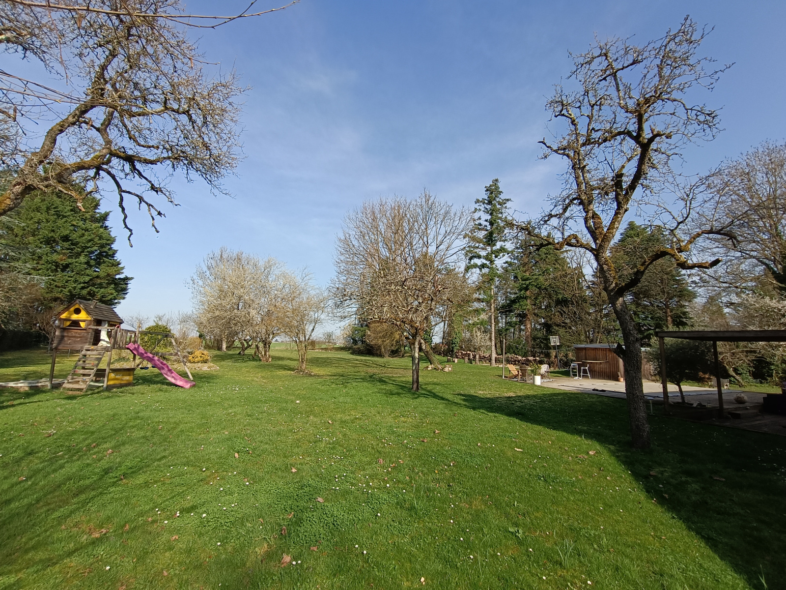 À l’extérieur, le charme opère tout autant avec son terrain de 3 679 m², sans vis-à-vis, ouvert sur les champs, sa piscine pour profiter pleinement des beaux jours sans oublié son terrain de pétanque pour des instants de détente typiquement estivaux